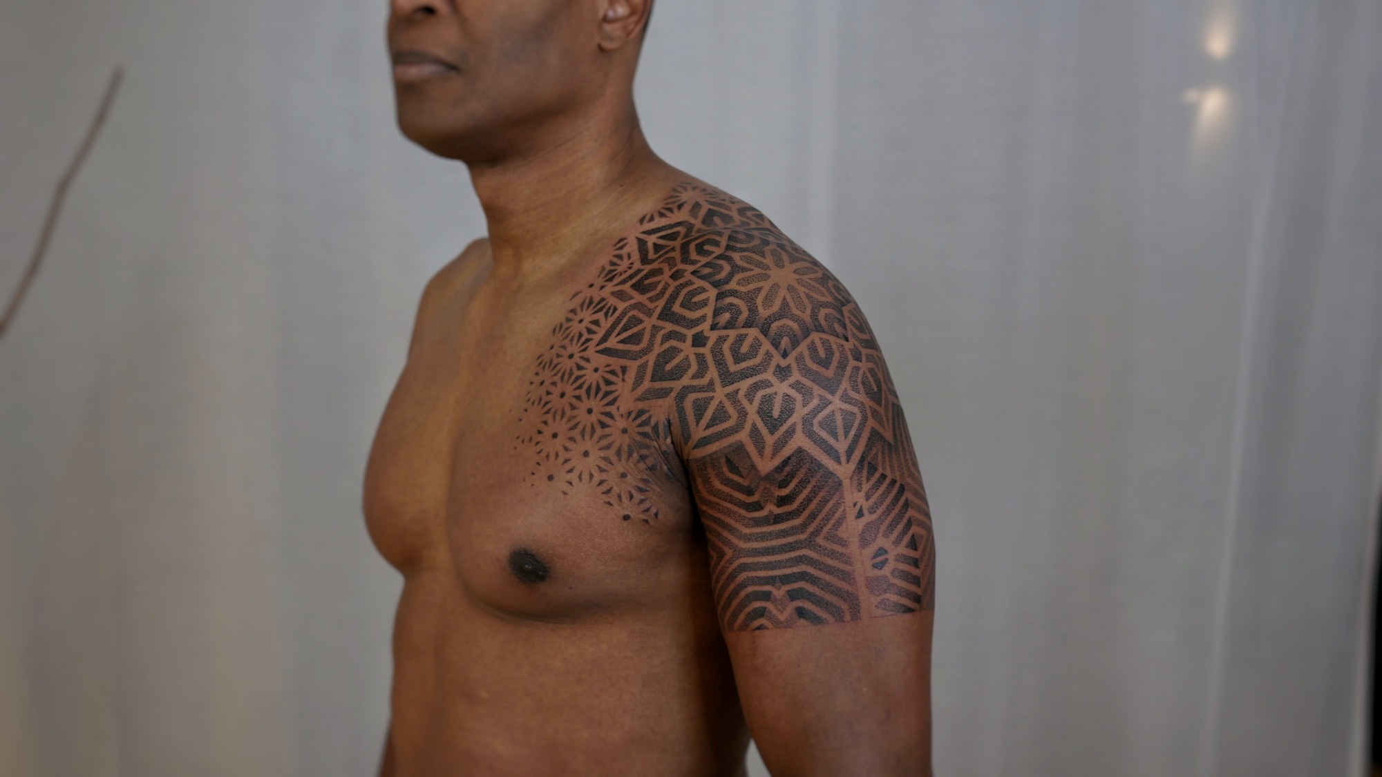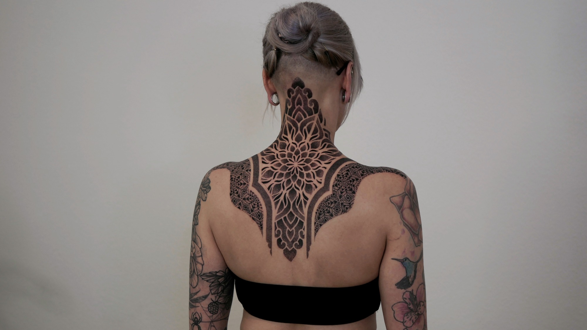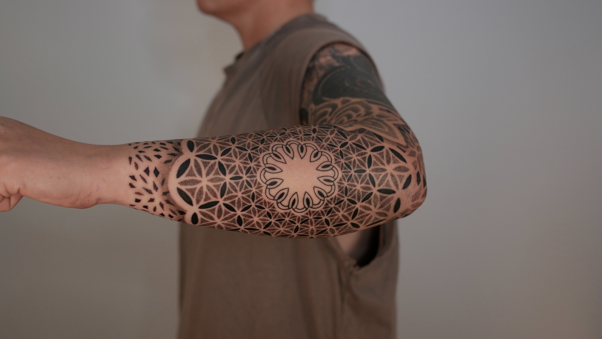 Er ist spezialisiert auf geometrische Muster, Mandalas und Ornamente im Dotwork Stil. Alle Designs werden exklusiv für die Person beim Termin gezeichnet und angepasst.
